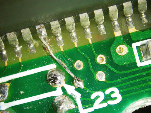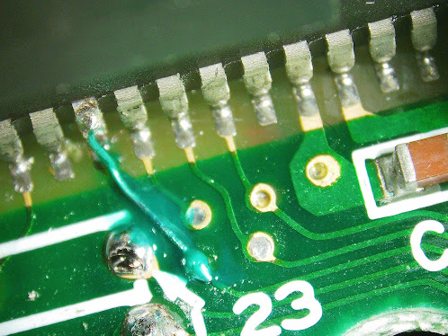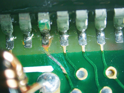 The break is not easy to see. Without removing the cartridge slot, this is quite a difficult area to get at but I persevered and got it patched and applied solder mask to the area.